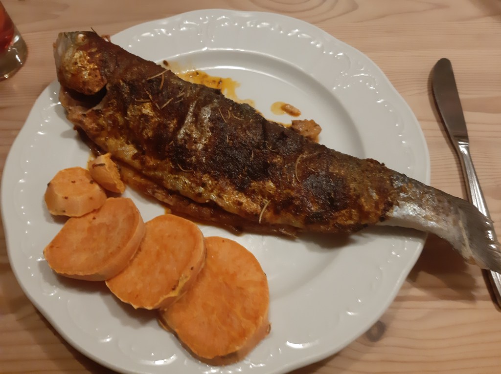 Heute war es ein sehr angenehmer Tag und hab ich eigentlich nur entspannt. Jetzt haben wir gerade ein gutes Abendessen gehabt. Es gab Fisch (eine Forelle). Jetzt schauen wir uns noch wahrscheinlich einen Film an. Am Nachmittag hab ich wieder einmal in meinem Buch gelesen und es war sehr schön. Nach dem Film werde ich noch ein bisschen entspannen und dann werde ich schlafen gehen. Morgen fahre ich wieder in die Stadt, denn ich hab einen Arzttermin.